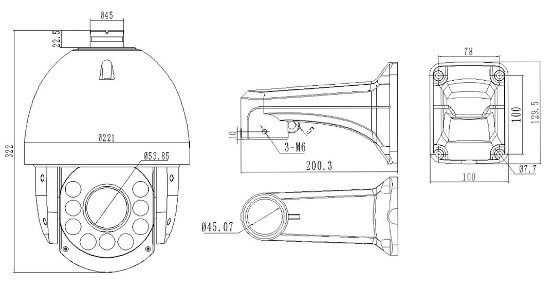 Khamera ea rona ea PTZ e boima ba 6 kg, e nang le boholo ba φ221Mm × 322, e etselitsoeng ho kenngoa habonolo.